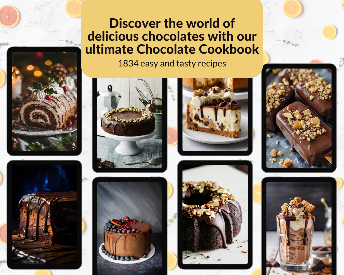 📘 "The Chocolate Encyclopedia" is a comprehensive digital cookbook featuring 1834 unique recipes for dessert and chocolate cake enthusiasts.